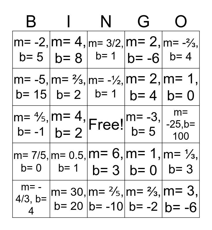 This bingo card has a free space and 51 words: m= 25, b= 20, m= 3, b= -6, m= 4, b= -1, m= ⅖, b= -10, m= 0.5, b= 1, m= -2, b= 12, m= 4, b= 8, m= ½, b= 14, m= -5, b= 15, m= -¾, b= 4, m= ⅔, b= 2, m= 2, b= -6, m= ⅓, b= 3, m= 1, b= 0, m= 4/3, b= -2, m= ⅖, b= 1, m= -½, b= 1, m= -3, b= 5, m= -2, b= -7, m= -⅔, b= 4, m= 4, b= 2, m= ⅔, b= -2, m= -2, b= 5, m= 2, b= 4, m= 3/2, b= 3, m= undefined, b= none, m= 1, b= 0, m= 0, b= -2, m= - 4/3, b= 4, m= 3/2, b= 1, m= -3/2, b= -2, m= 8, b= 55, m= -0.5, b= 34, m= 5, b= 3, m= 50, b= 25, m= 30, b= 20, m= 0.75, b= 3, m= 2.5, b= 20, m= -2,000, b= 30,000, m= 1.5, b= 5, m= -25,b= 100, m= 7/5, b= 0, m= none, b= -3, m= undefined, b= none, m= -1, b= 3, m= ⅖, b= ¼, m= ⅘, b= -1, m= 2, b= 8, m= -⅕, b= 7, m= 6, b= 3 and m= ⅔, b= 11.