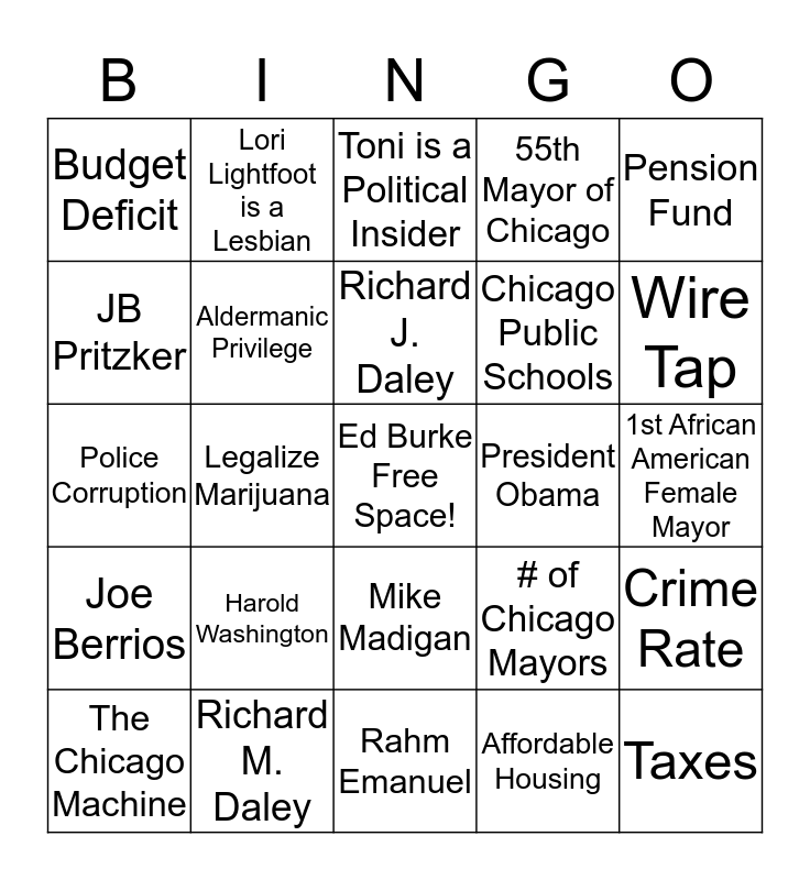 This bingo card has a free space and 24 words: Harold Washington, Richard M. Daley, Richard J. Daley, The Chicago Machine, Pension Fund, Budget Deficit, JB Pritzker, Lori Lightfoot is a Lesbian, President Obama, Mike Madigan, Chicago Public Schools, Police Corruption, # of Chicago Mayors, Crime Rate, Aldermanic Privilege, Affordable Housing, 1st African American Female Mayor, Toni is a Political Insider, Wire Tap, Legalize Marijuana, Taxes, Joe Berrios, 55th Mayor of Chicago and Rahm Emanuel.
