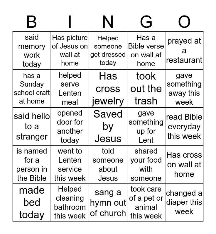 This bingo card has a free space and 29 words: made bed today, gave offering today, opened door for another today, prayed before breakfast today, said memory work today, Helped someone get dressed today, helped serve Lenten meal, went to Lenten service this week, gave something up for Lent, Helped cleaning bathroom this week, read Bible everyday this week, changed a diaper this week, sang a hymn out of church, took care of a pet or animal this week, gave something away this week, listened to christian music on radio, told someone about Jesus, is named for a person in the Bible, prayed at a restaurant, said hello to a stranger, shared your food with someone, said you were sorry, took out the trash, has a Sunday school craft at home, Has a Bible verse on wall at home, Has picture of Jesus on wall at home, Has cross on wall at home, Has cross jewelry and has a cloth cover on their Bible.