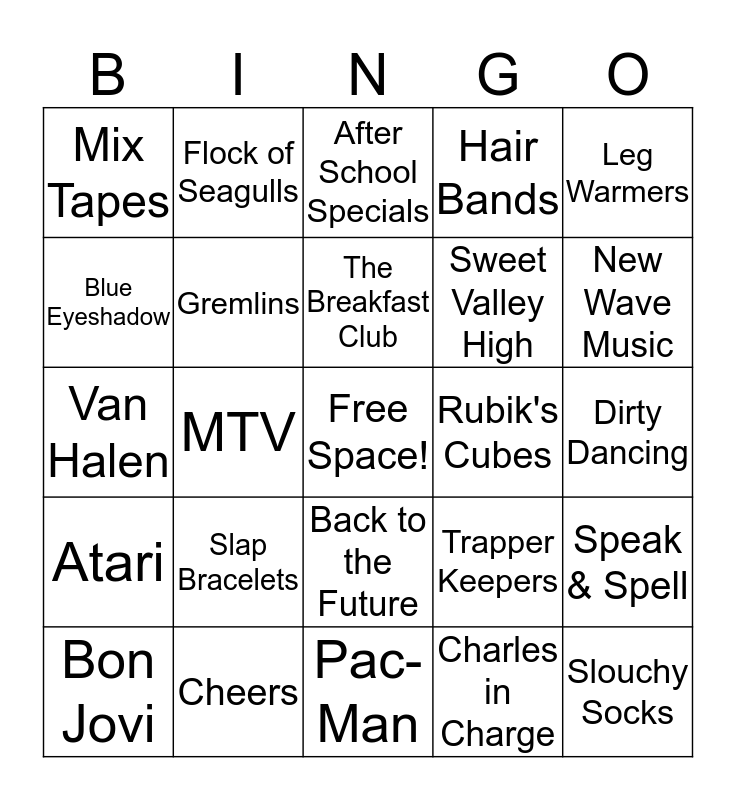 This bingo card has a free space and 30 words: Cheers, MASH, MTV, Cassette Tapes, Mix Tapes, After School Specials, Gremlins, Back to the Future, Rubik's Cubes, Pac-Man, Dirty Dancing, Slouchy Socks, Charles in Charge, Reading Rainbow, New Wave Music, Garbage Pail Kids, Trapper Keepers, Atari, Slap Bracelets, Leg Warmers, Van Halen, The Bangles, Flock of Seagulls, Sweet Valley High, Blue Eyeshadow, Hair Bands, Speak & Spell, Bon Jovi, The Breakfast Club and John Hughes.