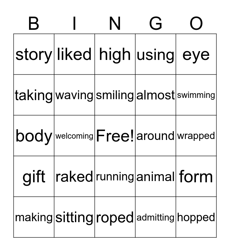 This bingo card has a free space and 29 words: making, planning, welcoming, discussed, story, high, waving, raked, around, sitting, wrapped, hopped, roped, admitting, swimming, light, running, gift, eye, body, animal, smiled, almost, taking, using, liked, form, smiling and color.