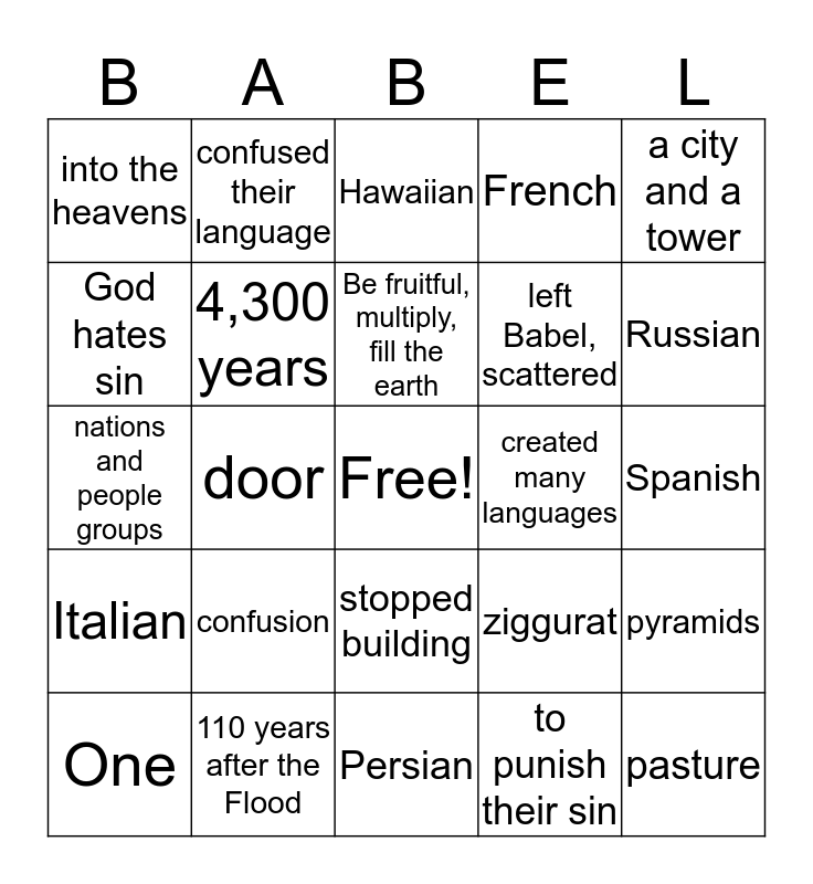 This bingo card has a free space and 24 words: confusion, 110 years after the Flood, Be fruitful, multiply, fill the earth, One, a city and a tower, into the heavens, God hates sin, confused their language, created many languages, stopped building, left Babel, scattered, nations and people groups, ziggurat, pyramids, 4,300 years, to punish their sin, Spanish, Hawaiian, Russian, door, pasture, Italian, French and Persian.