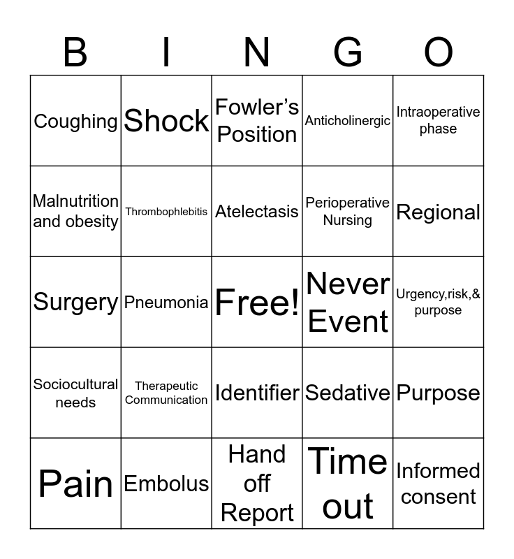 This bingo card has a free space and 24 words: Pain, Therapeutic Communication, Atelectasis, Time out, Intraoperative phase, Coughing, Shock, Fowler’s Position, Never Event, Urgency,risk,& purpose, Surgery, Thrombophlebitis, Sedative, Purpose, Malnutrition and obesity, Embolus, Hand off Report, Anticholinergic, Regional, Sociocultural needs, Pneumonia, Identifier, Perioperative Nursing and Informed consent.