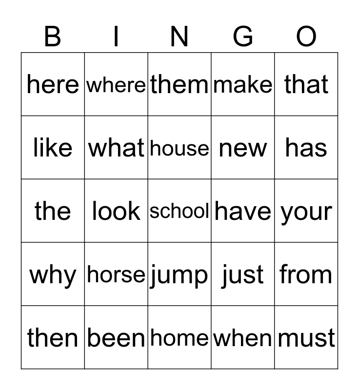 This bingo card has a free space and 34 words: how, when, they, who, why, what, that, then, where, this, house, them, this, there, have, has, been, the, horse, just, jump, you, here, your, home, must, make, now, new, like, little, look, from and for.