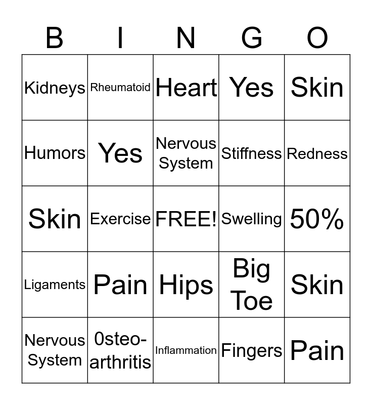 This bingo card has a free space and 24 words: Pain, 0steo-arthritis, Nervous System, Nervous System, Skin, Kidneys, Humors, Rheumatoid, Swelling, Hips, Stiffness, Skin, Big Toe, Skin, Yes, Fingers, 50%, Heart, Redness, Exercise, Pain, Ligaments, Yes and Inflammation.