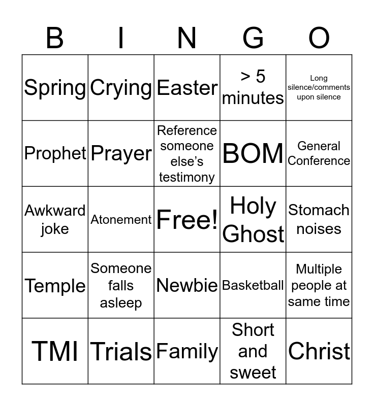 This bingo card has a free space and 28 words: Multiple people at same time, Love, BOM, Short and sweet, Prophet, Easter, Crying, Temple, Holy Ghost, TMI, Awkward joke, > 5 minutes, Trials, Family, General Conference, Thankamony, Someone falls asleep, Prayer, Reference someone else’s testimony, Newbie, Spring, I didn’t want to get up, but I’m here, Christ, Atonement, Stomach noises, Basketball, Long silence/comments upon silence and We go over.