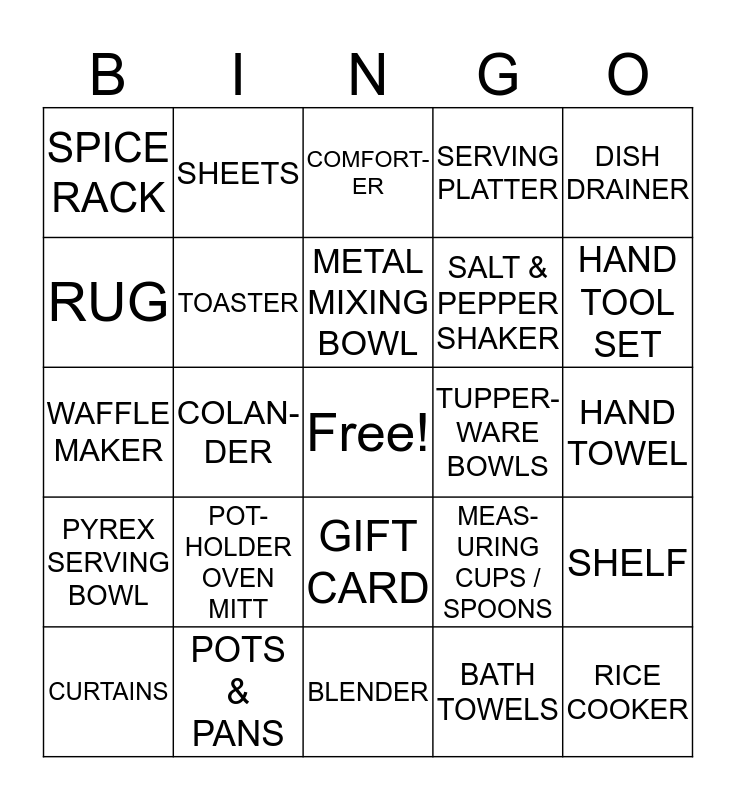 This bingo card has a free space and 25 words: POT-HOLDER OVEN MITT, BLENDER, METAL MIXING BOWL, CURTAINS, DISH DRAINER, SPICE RACK, RUG, SHEETS, TUPPER-WARE BOWLS, GIFT CARD, SALT & PEPPER SHAKER, WAFFLE MAKER, MEAS-URING CUPS / SPOONS, SHELF, TOASTER, FILING CABINET, HAND TOWEL, COMFORT-ER, HAND TOOL SET, COLAN-DER, RICE COOKER, POTS & PANS, PYREX SERVING BOWL, SERVING PLATTER and BATH TOWELS.