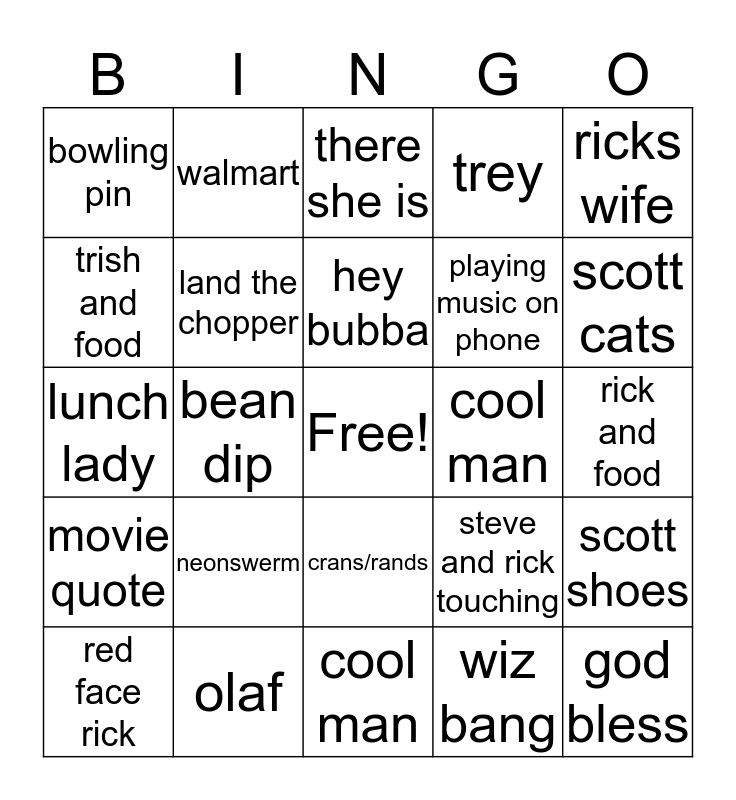 This bingo card has a free space and 24 words: neonswerm, olaf, hey bubba, red face rick, ricks wife, bowling pin, trish and food, walmart, cool man, crans/rands, playing music on phone, lunch lady, steve and rick touching, scott shoes, land the chopper, wiz bang, rick and food, there she is, scott cats, bean dip, god bless, movie quote, trey and cool man.