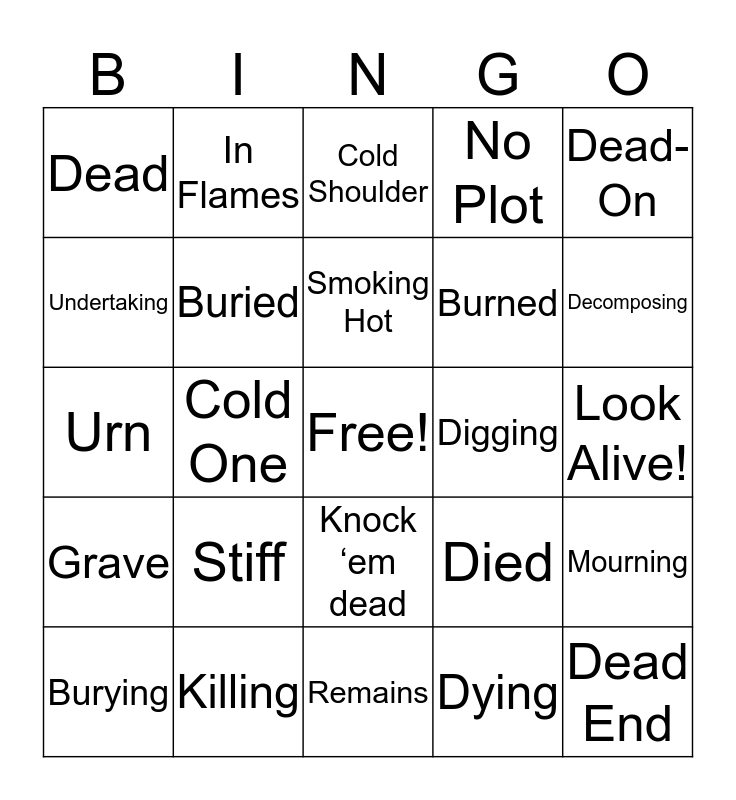 This bingo card has a free space and 24 words: Stiff, Killing, Smoking Hot, Burying, Dead-On, Dead, Undertaking, In Flames, Digging, Knock ‘em dead, Burned, Urn, Died, Mourning, Buried, Dying, Look Alive!, Cold Shoulder, Decomposing, Cold One, Dead End, Grave, No Plot and Remains.