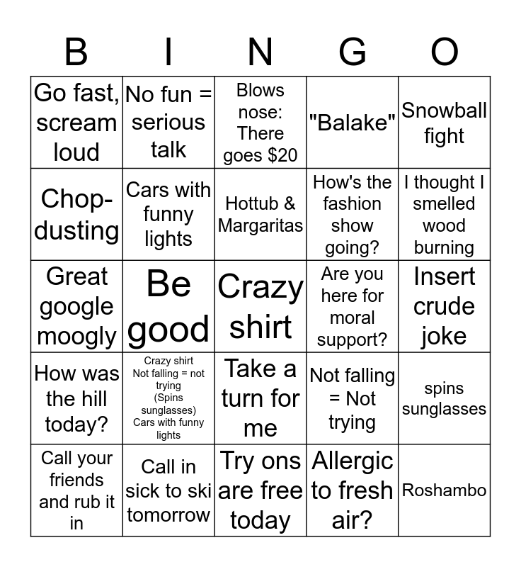 This bingo card has a free space and 25 words: Crazy shirt Not falling = not trying (Spins sunglasses) Cars with funny lights, Try ons are free today, Hottub & Margaritas, Call your friends and rub it in, Snowball fight, Go fast, scream loud, Chop-dusting, No fun = serious talk, Are you here for moral support?, Take a turn for me, How's the fashion show going?, Great google moogly, Not falling = Not trying, spins sunglasses, Cars with funny lights, Do you smell popcorn?, Insert crude joke, Blows nose: There goes $20, I thought I smelled wood burning, Be good, Roshambo, Call in sick to ski tomorrow, How was the hill today?, "Balake" and Allergic to fresh air?.