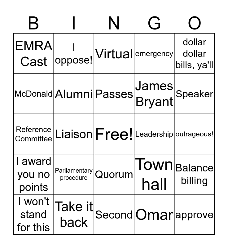This bingo card has a free space and 25 words: Parliamentary procedure, Second, Passes, I won't stand for this, dollar dollar bills, ya'll, EMRA Cast, McDonald, I oppose!, Leadership, Quorum, James Bryant, Reference Committee, Town hall, Balance billing, Alumni, Compensation, outrageous!, Virtual, Speaker, Liaison, approve, Take it back, I award you no points, emergency and Omar.