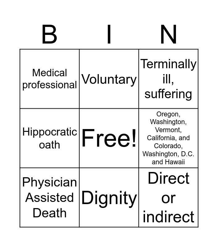 This bingo card has a free space and 11 words: PAS, Lethal, Oregon, Washington, Vermont, California, and Colorado, Washington, D.C. and Hawaii, Physician Assisted Death, Terminally ill, suffering, Medical professional, Dignity, terminal or incurable illnesses, Hippocratic oath, Voluntary and Direct or indirect.