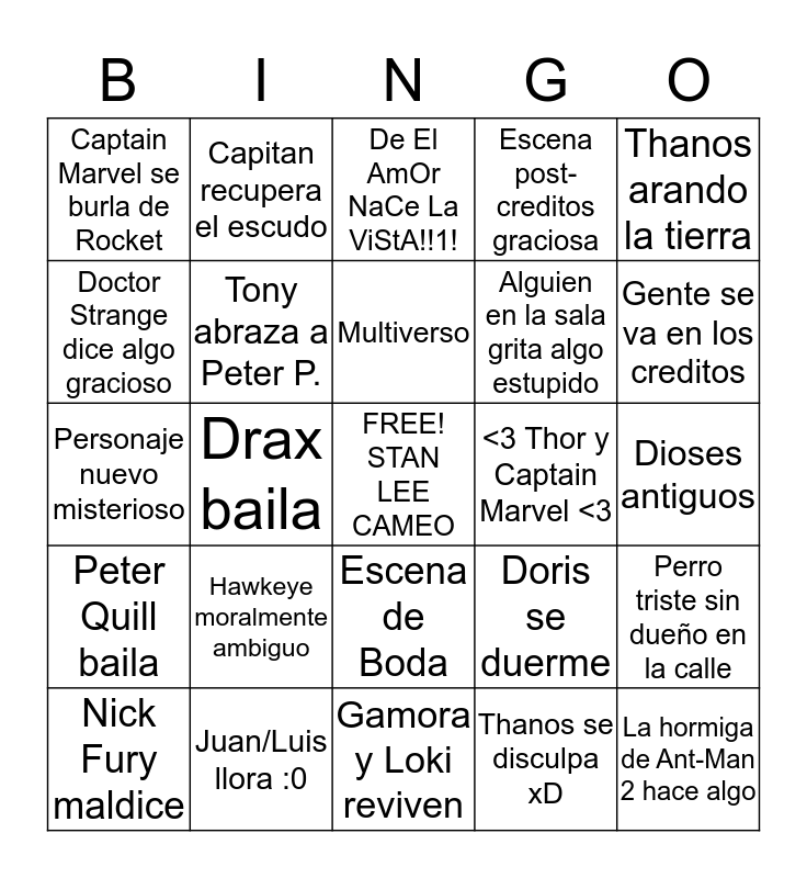 This bingo card has a free space and 39 words: TODOS REVIVEN ALV, Avengers Assemble!, Deadpool, Tony abraza a Peter P., Nick Fury maldice, Escena de Boda, Multiverso, Musica de los 80's, Thanos arando la tierra, Peter Quill baila, Drax baila, Escena post-creditos graciosa, La hormiga de Ant-Man 2 hace algo, Dioses antiguos, <3 Thor y Captain Marvel <3, Hawkeye moralmente ambiguo, Captain America se retira, Captain Marvel se burla de Rocket, Shannon va al baño durante la funcion, Doris se duerme, Doctor Strange dice algo gracioso, Gamora y Loki reviven, Alguien en la sala grita algo estupido, Gente se va en los creditos, Circle shot, Escena con todos peleando, Slow-mo, DoNdE eStUvO cApItAn MaRvEl?, Rocket pide una protesis, Capitan recupera el escudo, Steve y Tony hacen reparación de daños, Agus y Vero en la misma sala, De El AmOr NaCe La ViStA!!1!, Juan/Luis llora :0, Thanos se disculpa xD, Debate contra Thanos Round 2, Perro triste sin dueño en la calle, Personaje nuevo misterioso and Luis, amigo de Ant-Man.