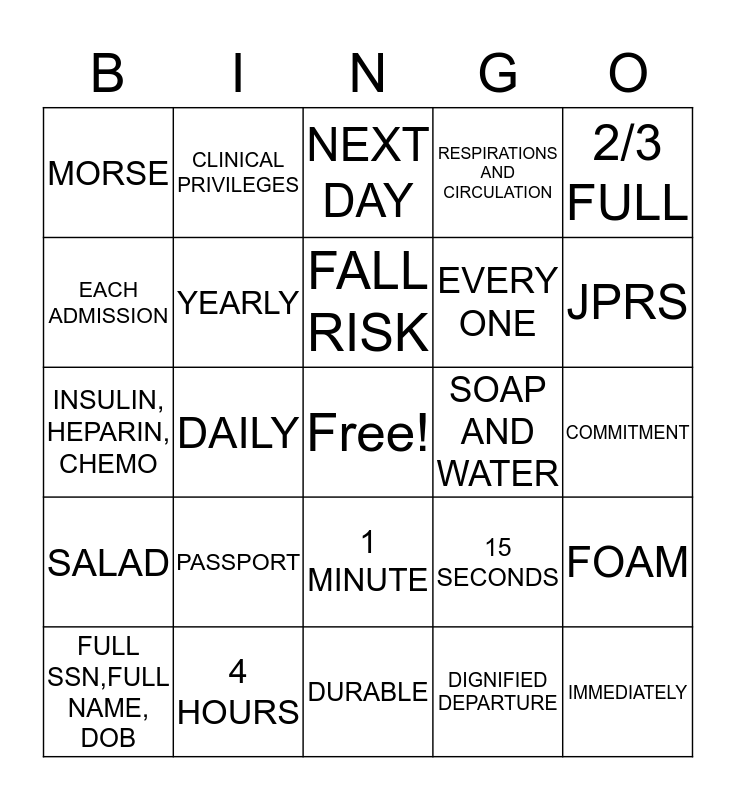 This bingo card has a free space and 36 words: PASS, RACE, CWAD, YEARLY, 15 SECONDS, SALAD, FALL RISK, LST, 2/3 FULL, DISPATCH, DAILY, RESPIRATIONS AND CIRCULATION, HOSPITAL, SOAP AND WATER, JPRS, MORSE, DIRTY UTILITY, PASSPORT, IMMEDIATELY, NEXT DAY, COMMITMENT, FOAM, 4 HOURS, FULL SSN,FULL NAME, DOB, DURABLE, CLINICAL PRIVILEGES, INSULIN, HEPARIN, CHEMO, BRADEN, EVERY ONE, EACH ADMISSION, NEXT VISIT, APPROVED ABBREVIATIONSIST, DIGNIFIED DEPARTURE, 1 MINUTE, TAG AND GREEN LOCK and 28 DAYS.
