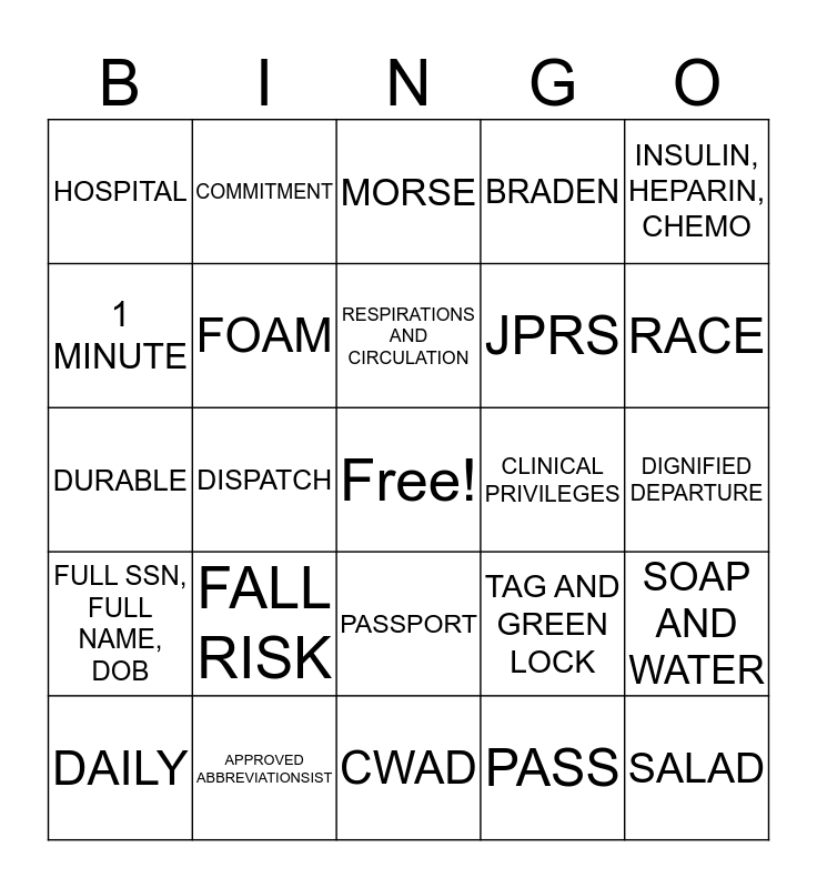 This bingo card has a free space and 37 words: NEXT DAY, 28 DAYS, TAG AND GREEN LOCK, FOAM, SOAP AND WATER, FALL RISK, RESPIRATIONS AND CIRCULATION, DIRTY UTILITY, INSULIN, HEPARIN, CHEMO, EACH ADMISSION, DISPATCH, BRADEN, SALAD, DIGNIFIED DEPARTURE, 1 MINUTE, FULL SSN, FULL NAME, DOB, 2/3 FULL, MORSE, PASSPORT, CLINICAL PRIVILEGES, HOSPITAL, RACE, DAILY, CWAD, IMMEDIATELY, PASS, COMMITMENT, NEXT VISIT, YEARLY, 15 SECONDS, EACH ADMISSION, APPROVED ABBREVIATIONSIST, DURABLE, 4 HOURS, TAG AND GREEN LOCK, JPRS and EVERYONE.