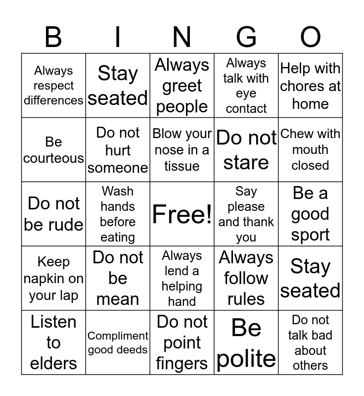 This bingo card has a free space and 59 words: Be civilized, Compliment good deeds, Apologize for a wrong deed, Keep napkin on your lap, Be polite, Respect your own and other’s property, Do not hurt someone, Be respectful, Do not stare, Sit up straight, Always talk with eye contact, Help in cleaning up, Be courteous, Develop good etiquette, Do not bite, Always respect differences, Do not talk bad about others, Help with chores at home, Say “bless you” when others sneeze, Blow your nose in a tissue, Say please and thank you, Always greet people, Listen to elders, Stay seated, Knock before you enter, Do not complain constantly, Hold the door open for others, Do not yell, Chew with mouth closed, Say sorry and excuse me, Do not gossip, Do not squeal, Do not interrupt, Be patient, Stay seated, Always ask for permission, Do not call names, Wash hands before eating, Do not burp loudly in public, Do not be rude, Flush toilet after use, Do not be mean, Be a good sport, Always wait for your turn, Be kind, Always be cordial, Be gracious, Put rubbish in bins, Always lend a helping hand, Do not point fingers, Respect your own and another’s property, Be quiet during a movie, Be quiet in the library, Do not be curt, Have integrity, Always follow rules, Listen carefully, Be punctual and Do not use bad language.