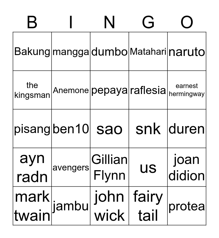 This bingo card has a free space and 24 words: avengers, jambu, pepaya, mark twain, naruto, Bakung, the kingsman, mangga, snk, Gillian Flynn, raflesia, pisang, us, joan didion, Anemone, fairy tail, duren, dumbo, earnest hermingway, ben10, protea, ayn radn, Matahari and john wick.