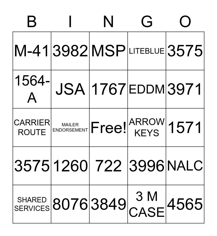 This bingo card has a free space and 24 words: 1260, 8076, 1767, SHARED SERVICES, 3575, M-41, 1564-A, 3982, ARROW KEYS, 722, EDDM, CARRIER ROUTE, 3996, NALC, JSA, 3 M CASE, 1571, MSP, 3971, MAILER ENDORSEMENT, 4565, 3575, LITEBLUE and 3849.