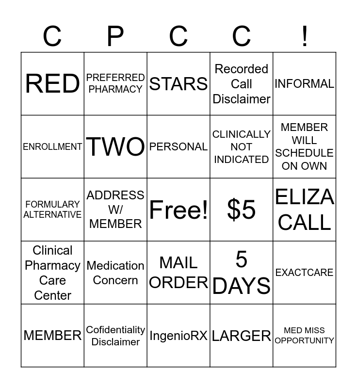 This bingo card has a free space and 24 words: Medication Concern, Cofidentiality Disclaimer, PERSONAL, MEMBER, INFORMAL, RED, ENROLLMENT, PREFERRED PHARMACY, $5, MAIL ORDER, CLINICALLY NOT INDICATED, FORMULARY ALTERNATIVE, 5 DAYS, EXACTCARE, TWO, LARGER, ELIZA CALL, STARS, MEMBER WILL SCHEDULE ON OWN, ADDRESS W/ MEMBER, MED MISS OPPORTUNITY, Clinical Pharmacy Care Center, Recorded Call Disclaimer and IngenioRX.
