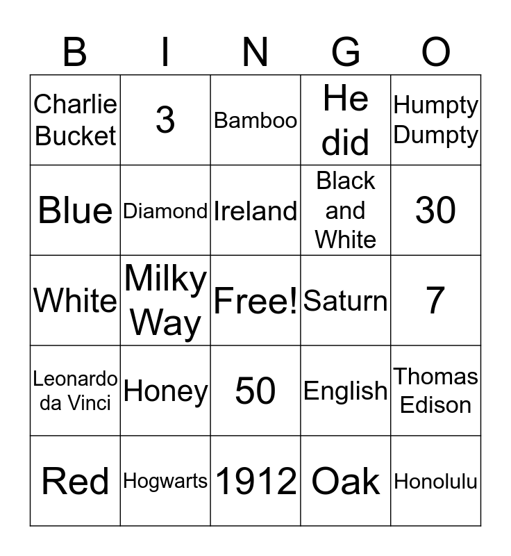 This bingo card has a free space and 24 words: Honey, Hogwarts, Ireland, Red, Humpty Dumpty, Charlie Bucket, Blue, 3, Saturn, 50, Black and White, White, English, Thomas Edison, Diamond, Oak, 7, Bamboo, 30, Milky Way, Honolulu, Leonardo da Vinci, He did and 1912.