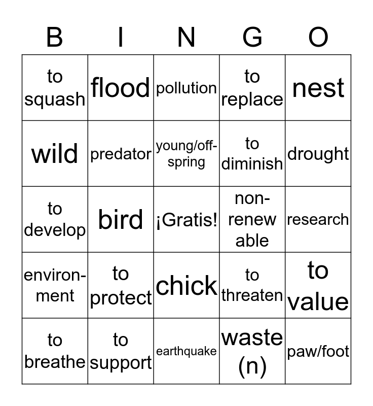 This bingo card has a free space and 27 words: to threaten, to fly, to diminish, earthquake, wild, pollution, flood, environ-ment, non-renew able, to value, to develop, to replace, to breathe, to support, drought, risk, predator, young/off-spring, to protect, to squash, research, waste (n), bird, paw/foot, chick, nest and population.