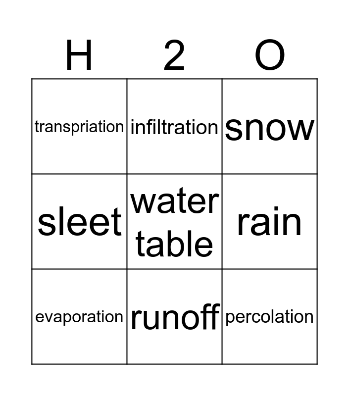 This bingo card has 14 words: aquifer, condensation, evaporation, infiltration, sleet, water table, percolation, precipitation, runoff, transpriation, zone of saturation, rain, snow and hail.