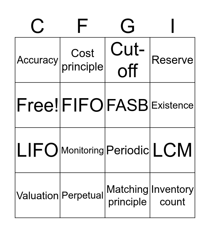 This bingo card has 16 words: Perpetual, LCM, Cut-off, Accuracy, LIFO, Cost principle, Periodic, Matching principle, Free!, FIFO, Valuation, Reserve, Monitoring, Existence, FASB and Inventory count.