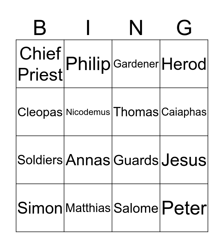 This bingo card has 16 words: Matthias, Jesus, Gardener, Chief Priest, Soldiers, Philip, Guards, Salome, Cleopas, Nicodemus, Simon, Herod, Annas, Caiaphas, Thomas and Peter.