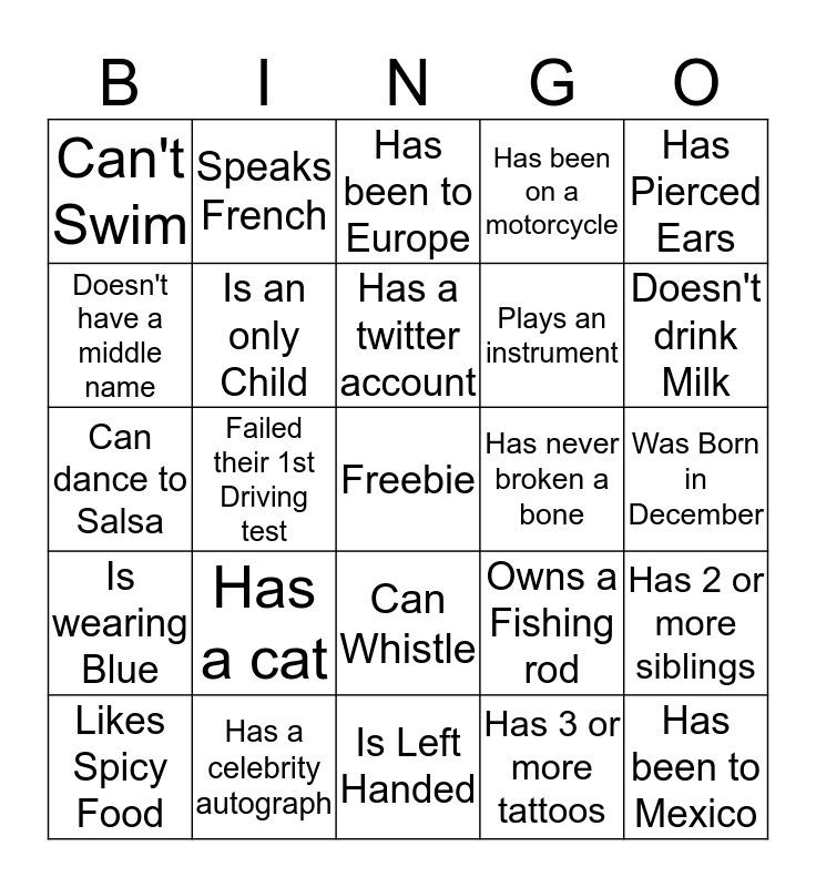This bingo card has a free space and 24 words: Has a cat, Has a celebrity autograph, Has a twitter account, Likes Spicy Food, Has Pierced Ears, Can't Swim, Doesn't have a middle name, Speaks French, Has never broken a bone, Can Whistle, Plays an instrument, Can dance to Salsa, Owns a Fishing rod, Has 2 or more siblings, Is an only Child, Has 3 or more tattoos, Was Born in December, Has been to Europe, Doesn't drink Milk, Failed their 1st Driving test, Has been to Mexico, Is wearing Blue, Has been on a motorcycle and Is Left Handed.