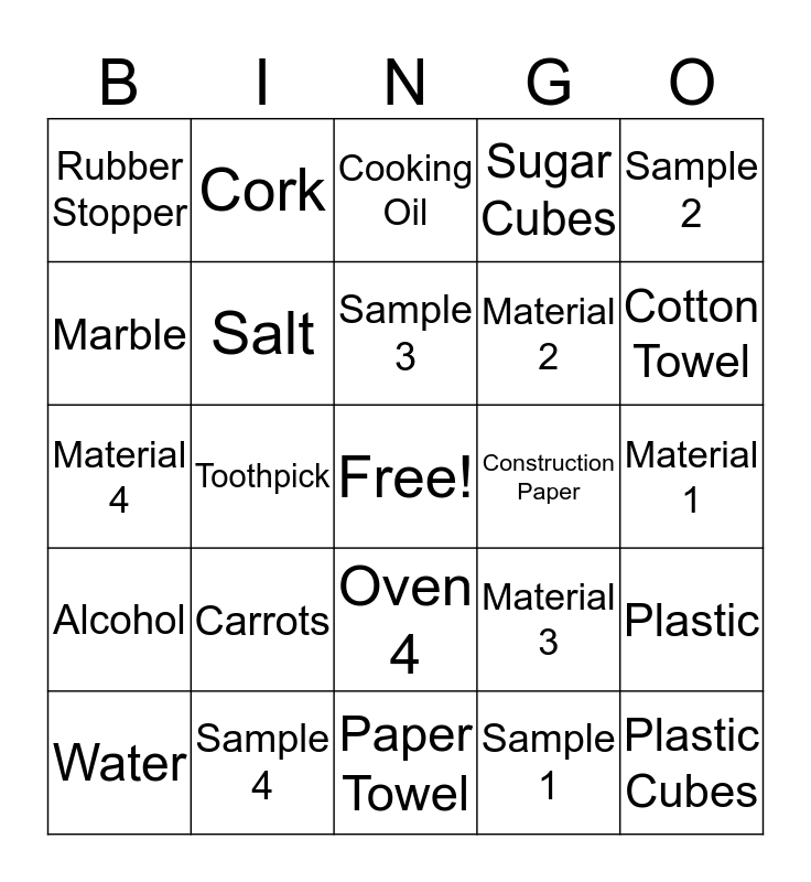 This bingo card has a free space and 26 words: Oven 4, Sample 1, Sample 3, Sample 4, Sample 2, Rubber Stopper, Marble, Cork, Material 1, Material 3, Material 2, Material 4, Plastic, Water, Toothpick, Table Salt, Sugar Cubes, Alcohol, Cooking Oil, Plastic Cubes, Cotton Towel, Paper Towel, Construction Paper, Carrots, Salt and Butter.