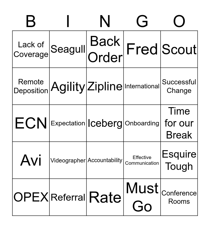 This bingo card has a free space and 24 words: Videographer, Referral, Zipline, OPEX, Scout, Lack of Coverage, Remote Deposition, Seagull, Onboarding, Accountability, International, ECN, Effective Communication, Esquire Tough, Agility, Must Go, Time for our Break, Back Order, Successful Change, Expectation, Conference Rooms, Avi, Fred and Rate.