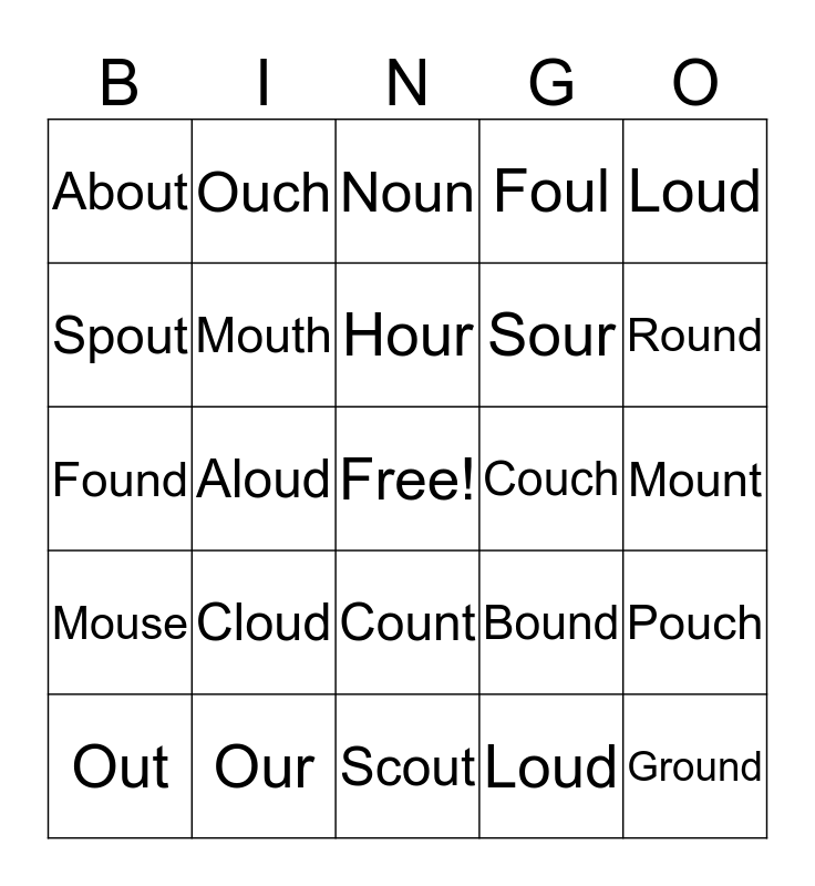 This bingo card has a free space and 24 words: Cloud, Our, Hour, Out, Loud, About, Spout, Ouch, Couch, Count, Sour, Found, Bound, Pouch, Mouth, Loud, Mount, Noun, Round, Aloud, Ground, Mouse, Foul and Scout.