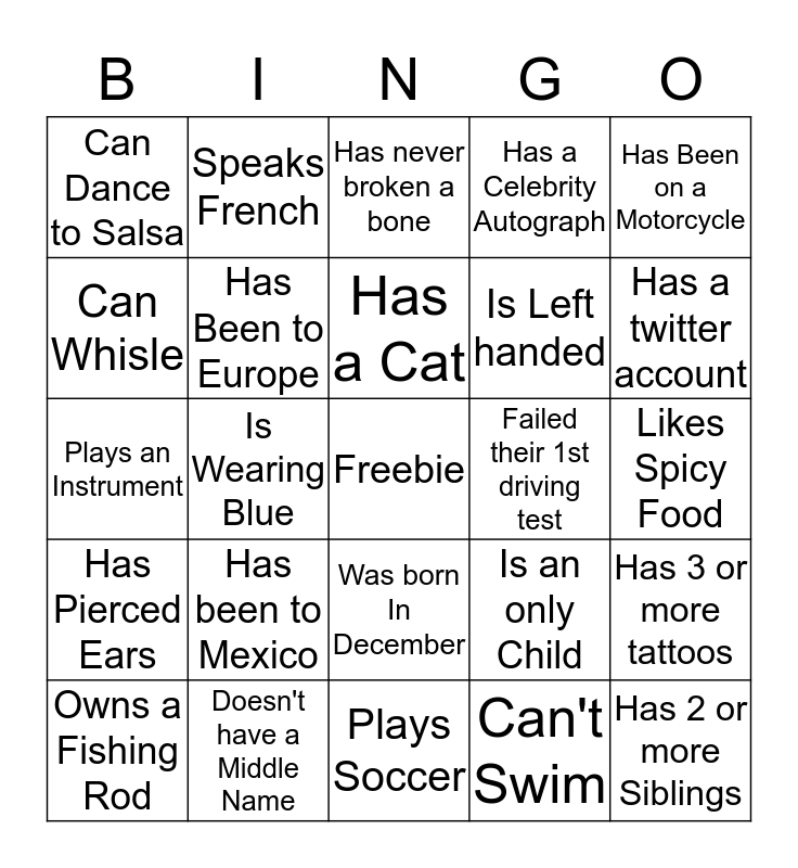 This bingo card has a free space and 24 words: Has been to Mexico, Doesn't have a Middle Name, Has a Cat, Owns a Fishing Rod, Has Been on a Motorcycle, Can Dance to Salsa, Can Whisle, Speaks French, Failed their 1st driving test, Was born In December, Is Left handed, Plays an Instrument, Is an only Child, Has 3 or more tattoos, Has Been to Europe, Can't Swim, Likes Spicy Food, Has never broken a bone, Has a twitter account, Is Wearing Blue, Has 2 or more Siblings, Has Pierced Ears, Has a Celebrity Autograph and Plays Soccer.
