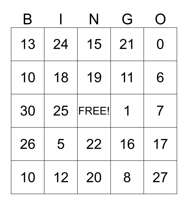 This bingo card has a free space and 24 words: 5, 12, 19, 10, 0, 13, 10, 24, 1, 22, 11, 30, 16, 17, 18, 8, 7, 15, 6, 25, 27, 26, 21 and 20.