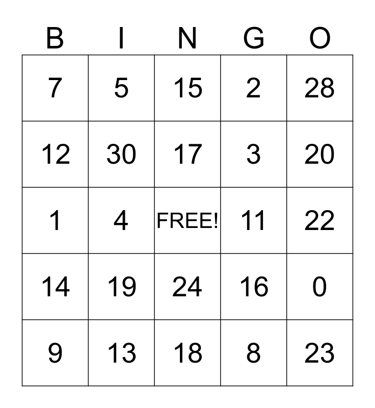 This bingo card has a free space and 24 words: 19, 13, 17, 9, 28, 7, 12, 5, 11, 24, 3, 1, 16, 0, 30, 8, 22, 15, 20, 4, 23, 14, 2 and 18.