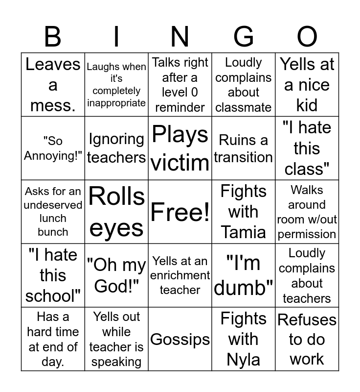 This bingo card has a free space and 24 words: "Oh my God!", Yells out while teacher is speaking, Plays victim, Has a hard time at end of day., Yells at a nice kid, Leaves a mess., "So Annoying!", Laughs when it's completely inappropriate, Fights with Tamia, Yells at an enrichment teacher, Ruins a transition, Asks for an undeserved lunch bunch, "I'm dumb", Loudly complains about teachers, Ignoring teachers, Fights with Nyla, Walks around room w/out permission, Talks right after a level 0 reminder, "I hate this class", Rolls eyes, Refuses to do work, "I hate this school", Loudly complains about classmate and Gossips.