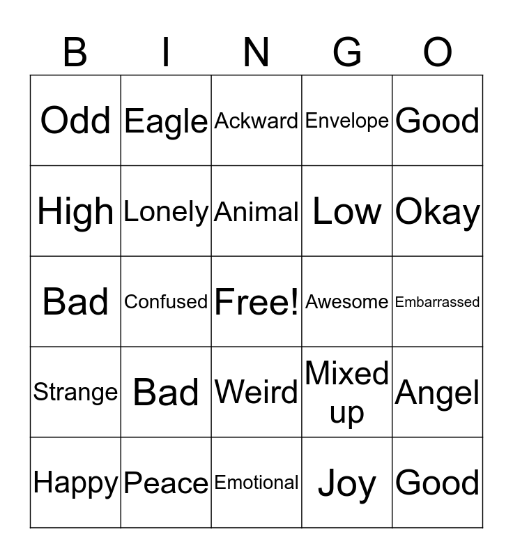This bingo card has a free space and 29 words: Happy, Sad, Confused, Excited, Odd, Ackward, Lonely, Bad, Awesome, Peace, Embarrassed, Good, Emotional, Joy, Okay, Scared, Weird, Strange, Good, Bad, Mixed up, Excellent, Low, High, Envelope, Eagle, Angel, Animal and Bird.