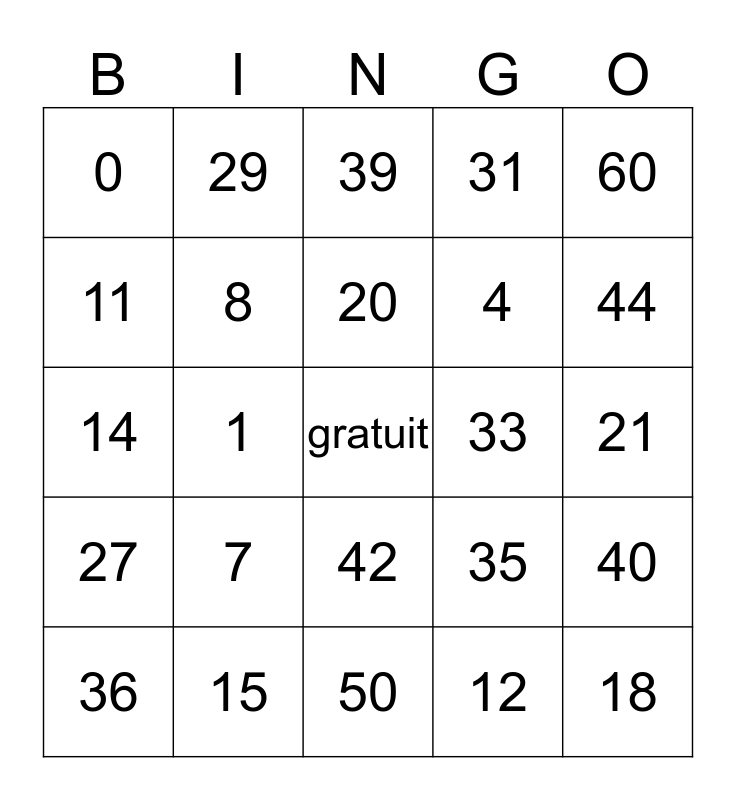 This bingo card has a free space and 24 words: 7, 15, 20, 36, 60, 0, 11, 29, 33, 42, 4, 14, 35, 40, 8, 12, 21, 39, 44, 1, 18, 27, 31 and 50.