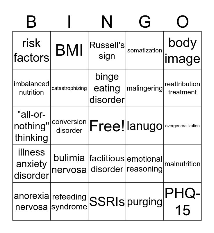 This bingo card has a free space and 24 words: anorexia nervosa, bulimia nervosa, binge eating disorder, purging, body image, risk factors, BMI, Russell's sign, lanugo, overgeneralization, "all-or-nothing" thinking, catastrophizing, emotional reasoning, malnutrition, imbalanced nutrition, refeeding syndrome, SSRIs, somatization, reattribution treatment, illness anxiety disorder, conversion disorder, factitious disorder, malingering and PHQ-15.