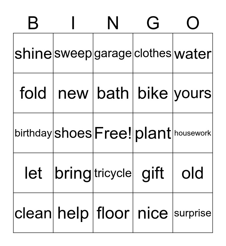 This bingo card has a free space and 24 words: bring, help, bath, clean, water, shine, fold, sweep, plant, tricycle, bike, birthday, gift, old, new, nice, housework, garage, yours, shoes, surprise, let, clothes and floor.