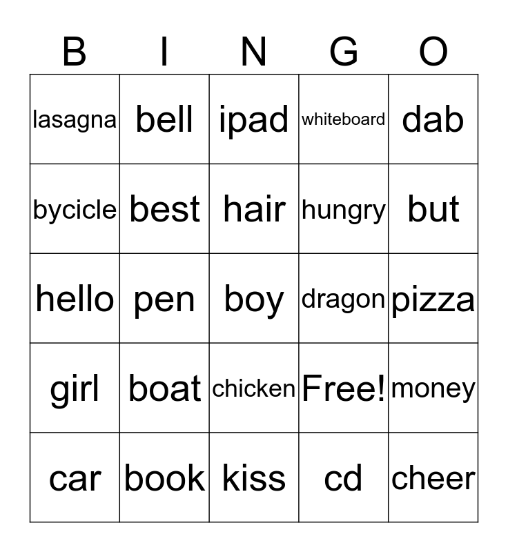 This bingo card has 25 words: boat, kiss, hair, car, dab, lasagna, bycicle, bell, dragon, chicken, hungry, hello, Free!, money, best, cheer, pizza, ipad, but, pen, boy, book, girl, whiteboard and cd.