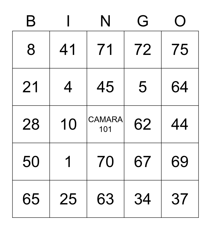 This bingo card has a free space and 24 words: 1, 25, 45, 65, 75, 8, 21, 41, 62, 70, 5, 28, 67, 69, 4, 34, 44, 71, 64, 10, 37, 50, 72 and 63.