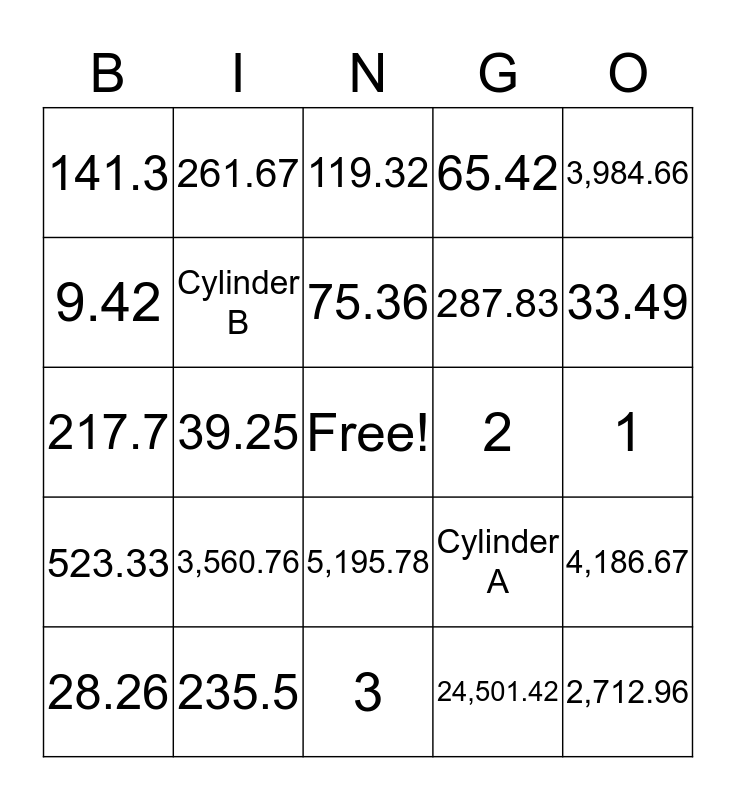 This bingo card has a free space and 24 words: 3,560.76, 235.5, 75.36, 28.26, 3,984.66, 141.3, 9.42, 261.67, 2, 5,195.78, 287.83, 217.7, Cylinder A, 4,186.67, Cylinder B, 24,501.42, 1, 119.32, 33.49, 39.25, 2,712.96, 523.33, 65.42 and 3.