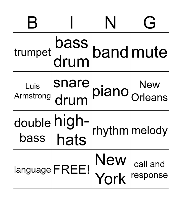 This bingo card has 24 words: swing, jazz, New Orleans, radio, Luis Armstrong, trumpet, snare drum, bass drum, FREE!, blues, double bass, rhythm, improvise, scat, piano, trombone, New York, band, high-hats, melody, language, call and response, mute and Chicago.
