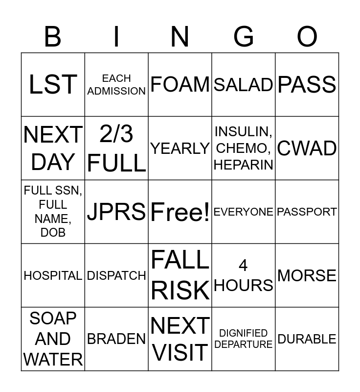 This bingo card has a free space and 36 words: 28 DAYS, 1 MINUTE, 15 SECONDS, 2/3 FULL, 4 HOURS, HOSPITAL, YEARLY, DAILY, PASS, COMMITMENT, JPRS, SALAD, RACE, EVERYONE, CWAD, LST, IMMEDIATELY, DISPATCH, DURABLE, FOAM, PASSPORT, MORSE, BRADEN, SOAP AND WATER, NEXT VISIT, EACH ADMISSION, FULL SSN, FULL NAME, DOB, CLINICAL PRIVILEGES, INSULIN, CHEMO, HEPARIN, NEXT DAY, RESPIRATIONS AND CIRCULATION, APPROVED ABBREVIATIONS LIST, DIGNIFIED DEPARTURE, FALL RISK, TAG AND GREEN LOCK and DIRTY UTILITY.