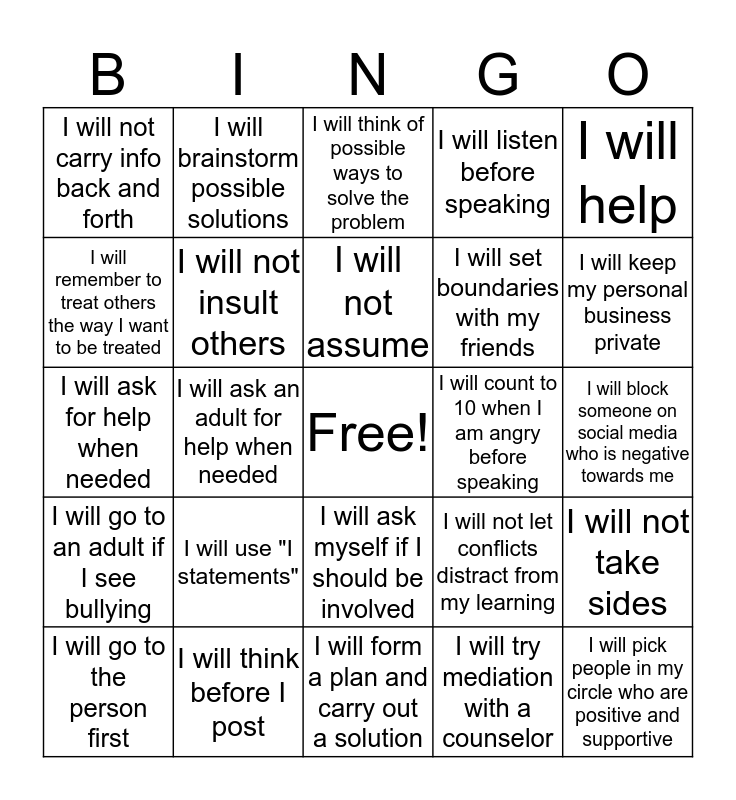 This bingo card has a free space and 29 words: I will go to the person first, I will not assume everything I hear is true, I will ask an adult for help when needed, I will evaluate the intent of the person bringing me info, I will not carry info back and forth, I will think of possible ways to solve the problem, I will not insult others, I will use "I statements", I will count to 10 when I am angry before speaking, I will think before I post, I will block someone on social media who is negative towards me, I will pick people in my circle who are positive and supportive, I will form a plan and carry out a solution, I will try mediation with a counselor, I will keep my personal business private, I will not share the private business of others, I will ask myself if I should be involved, I will go to an adult if I see bullying, I will help, I will ask for help when needed, I will not let conflicts distract from my learning, I will recognize when I have overstepped, I will set boundaries with my friends, I will remember to treat others the way I want to be treated, I will listen before speaking, I will brainstorm possible solutions, I will not take sides, I will not assume and I will understand the entire problem before jumping in..
