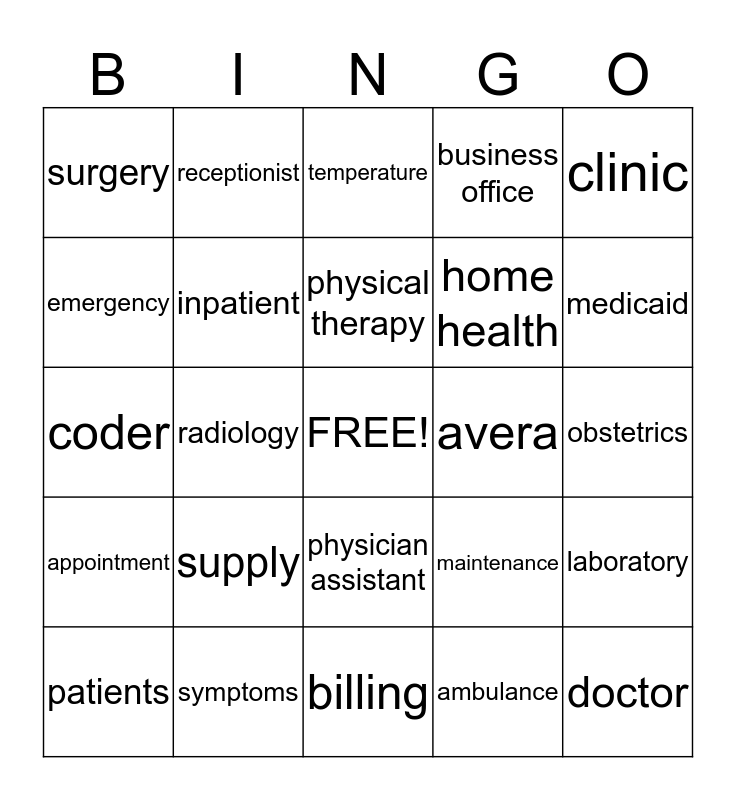 This bingo card has a free space and 52 words: nurse, doctor, administrator, billing, supply, medical records, receptionist, dietary, emergency, outpatient, inpatient, outreach, laboratory, maintenance, transcription, operating, physical therapy, avera, hospital, clinic, radiology, ambulance, surgery, home health, geriatric, mammogram, syringe, tribal health, medicaid, medicare, insurance, business office, scheduling, notification, pre authorization, temperature, symptoms, heart rate, echocardiogram, venus doppler, mri, obstetrics, appointment, xray, physician assistant, diagnosis, patient coordinator, coder, scope, pharmacy, patients and echart.