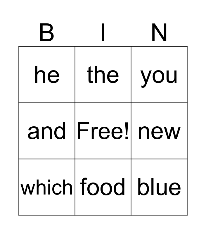This bingo card has a free space and 8 words: and, the, new, which, you, he, food and blue.