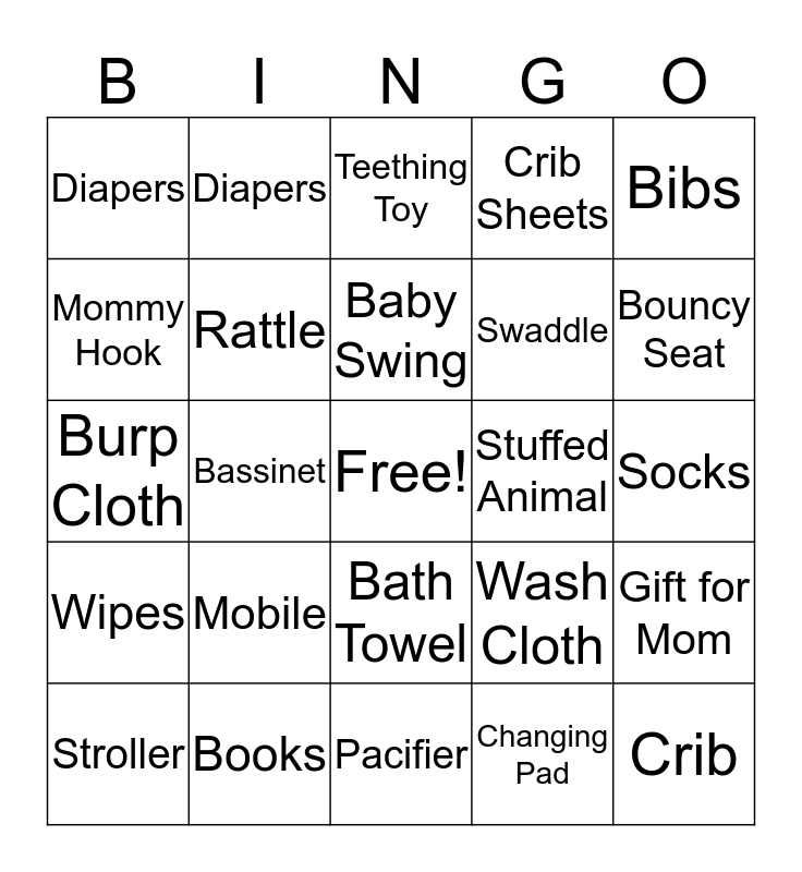 This bingo card has a free space and 33 words: Baby Shampoo, Baby Carrier, Bassinet, Baby Lotion, Wipes, Rattle, Bibs, Stroller, Diapers, Blanket, Baby Swing, Teething Toy, Bottles, Baby Monitor, Stuffed Animal, Bouncy Seat, Books, Burp Cloth, Mobile, Wash Cloth, Bath Towel, Onesie, Diapers, Socks, Pacifier, Crib, Crib Sheets, Swaddle, Mommy Hook, Gift for Mom, Diaper Bag, Changing Pad and Car Seat/Carrier.