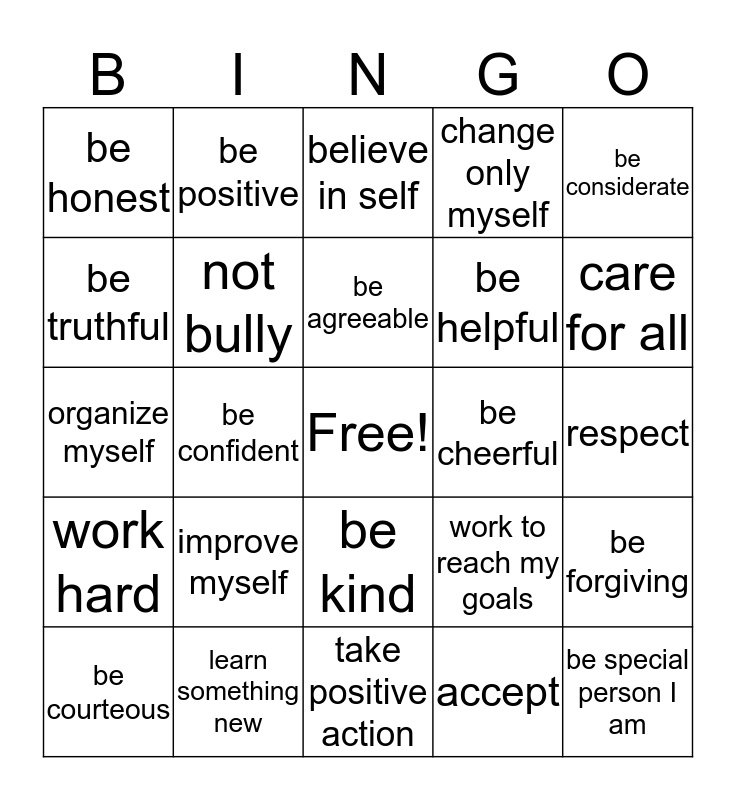 This bingo card has a free space and 24 words: improve myself, learn something new, be agreeable, be courteous, be considerate, be honest, be truthful, be positive, be cheerful, be kind, be helpful, organize myself, work to reach my goals, be forgiving, not bully, accept, respect, believe in self, care for all, be confident, be special person I am, work hard, change only myself and take positive action.